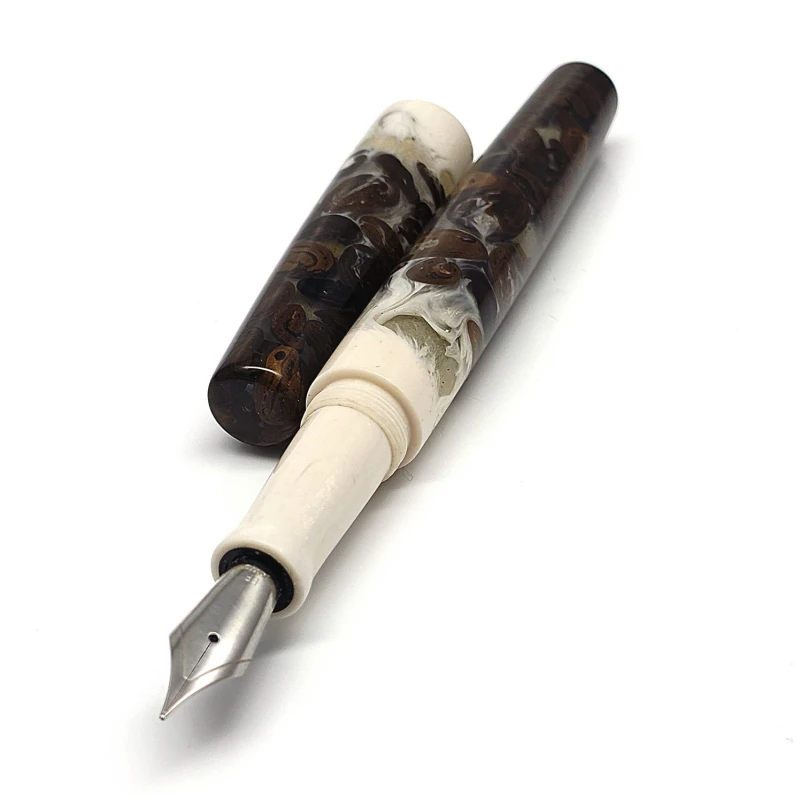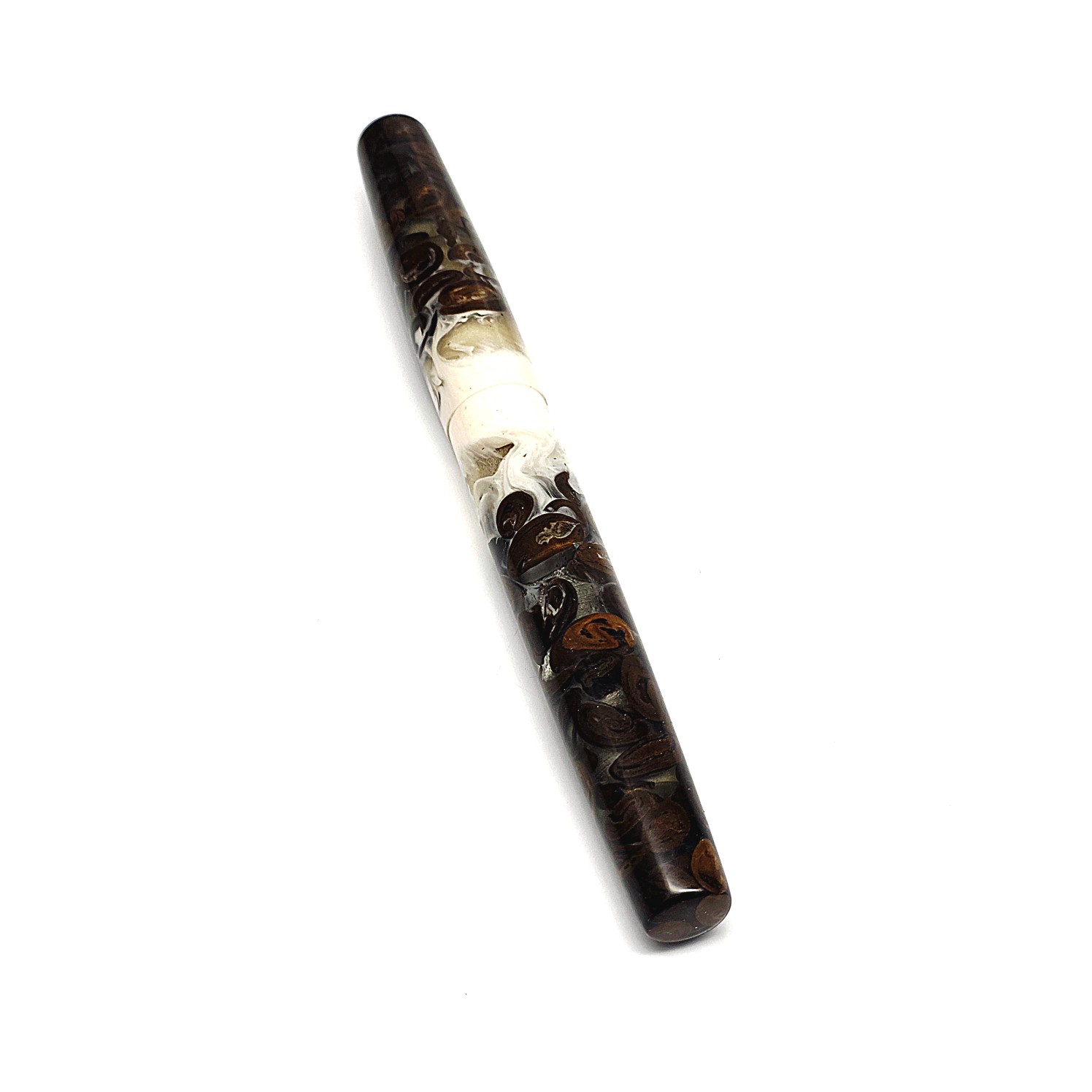 Flat white - to hołd dla jednej z najbardziej wyrafinowanych kaw – kawy Flat White. Ta subtelna kompozycja łączy w sobie elegancję i smak, tworząc niezapomniane doświadczenie. W tym piórze zalaliśmy w żywicy całe ziarna kawy. Kolor żywicy na sekcji i styku korpusu ze skuwką jest odzwierciedleniem kawy Flat White. Wybór koloru jest subtelny, ale wyraźny – jak pierwszy łyk tej wyjątkowej kawy. Chromowa stalówka Jowo jest doskonałym dopełnieniem całego pióra. To jak dodanie ostatniego składnika do kawy – pióro staje się kompletnym dziełem sztuki. Niech każdy ruch stalówki przypomina Ci o ulubionym napoju i chwilach spędzonych przy filiżance Flat White.