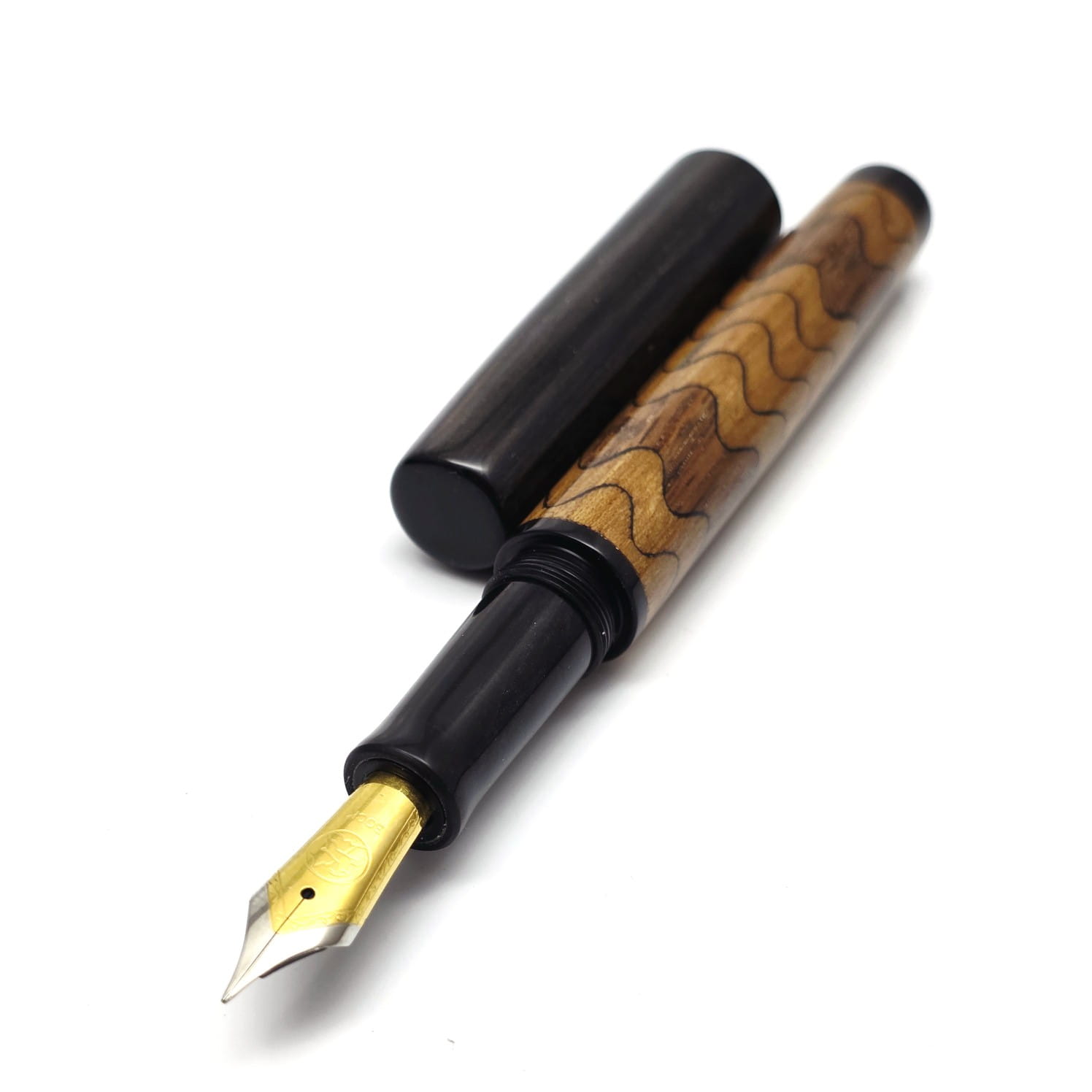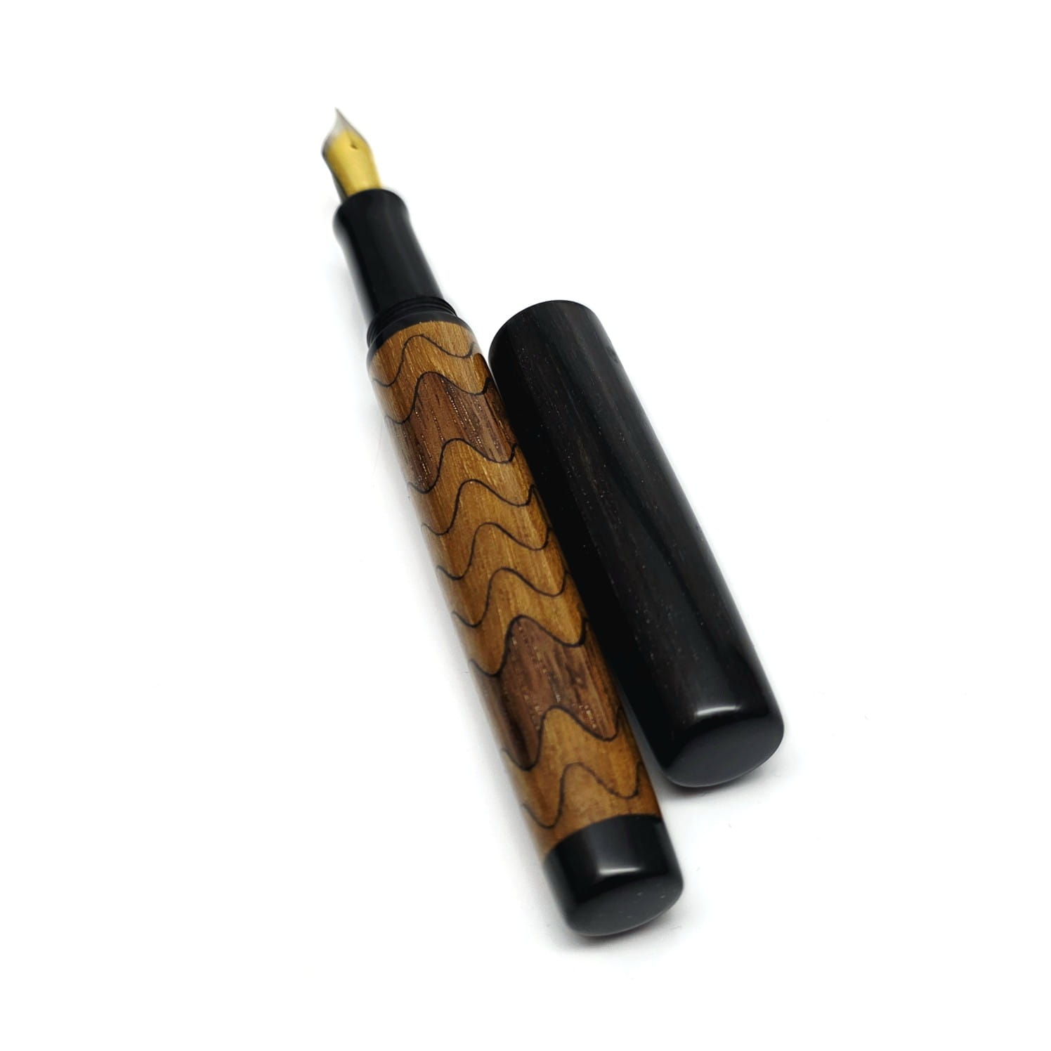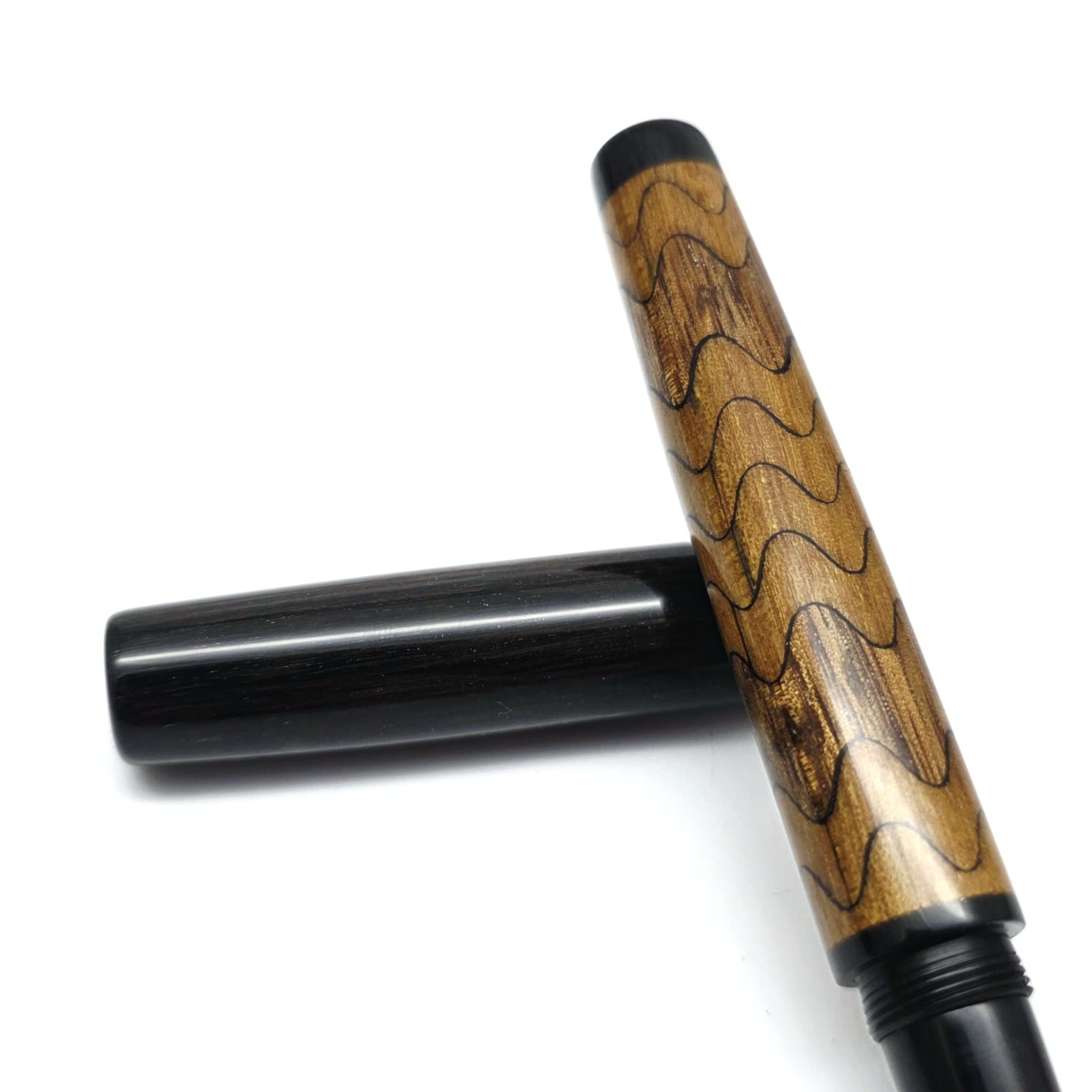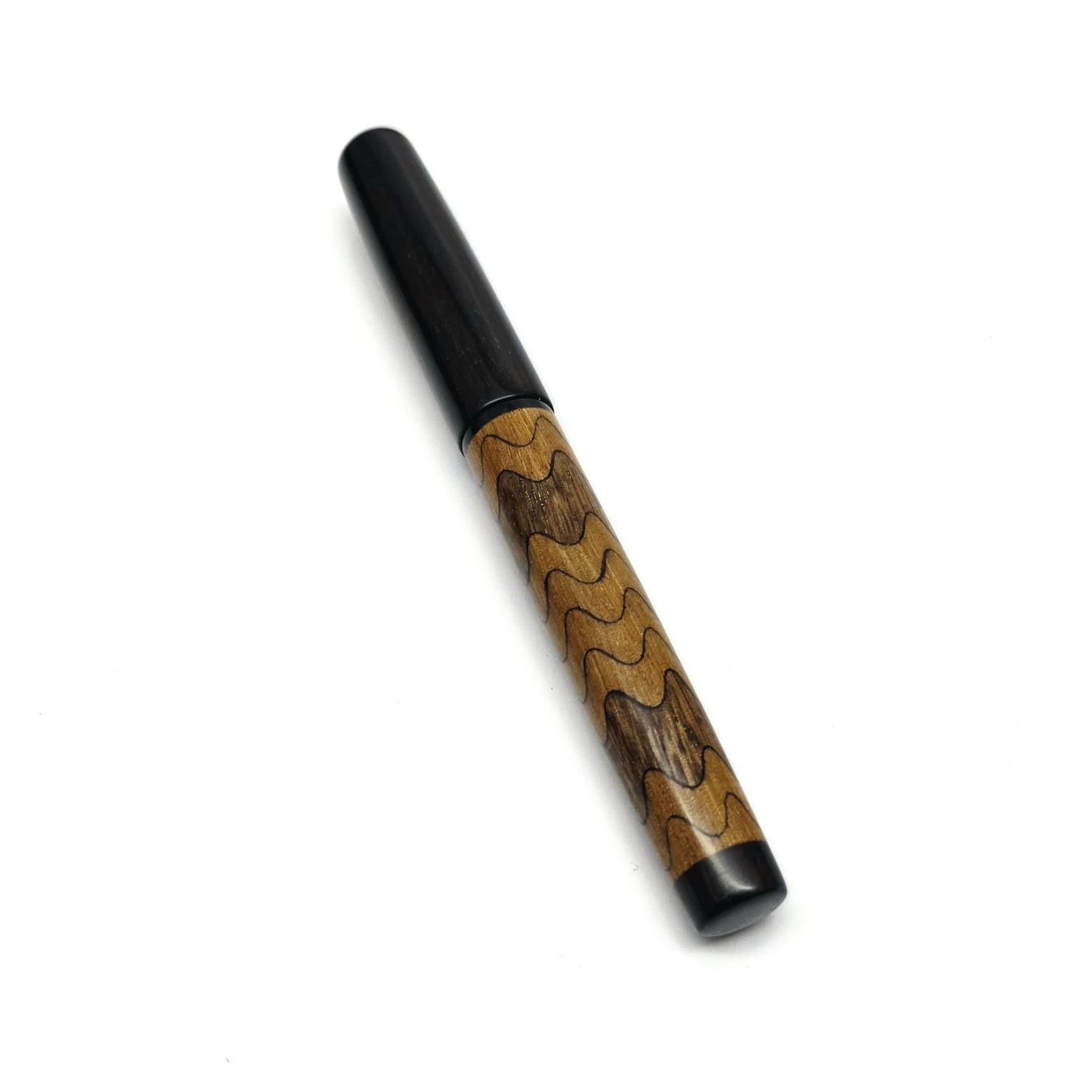 Dwukolorowa fala – to najbardziej klasyczna forma fali, jaką zrobiliśmy. Dwa rodzaje drewna faliście nachodzą na siebie na korpusie, natomiast skuwka i zakończenie pióra jest z czarnego dębu. Jasne fale to drewno śliwy, które daje taki ciepły żółty odcień. Ciemne fale pochodzą z orzecha amerykańskiego, którego uroda dorównuje twardości i wytrzymałości. Obie barwy w ciepłej tonacji ładnie do siebie pasują. Z jaśniejszym korpusem dobrze kontrastuje czarna skuwka i zakończenie korpusu z czarnego dębu i czarna żywiczna sekcja. To pióro pięknie prezentuje się z dwukolorową stalówką Bock o dowolnej grubości.